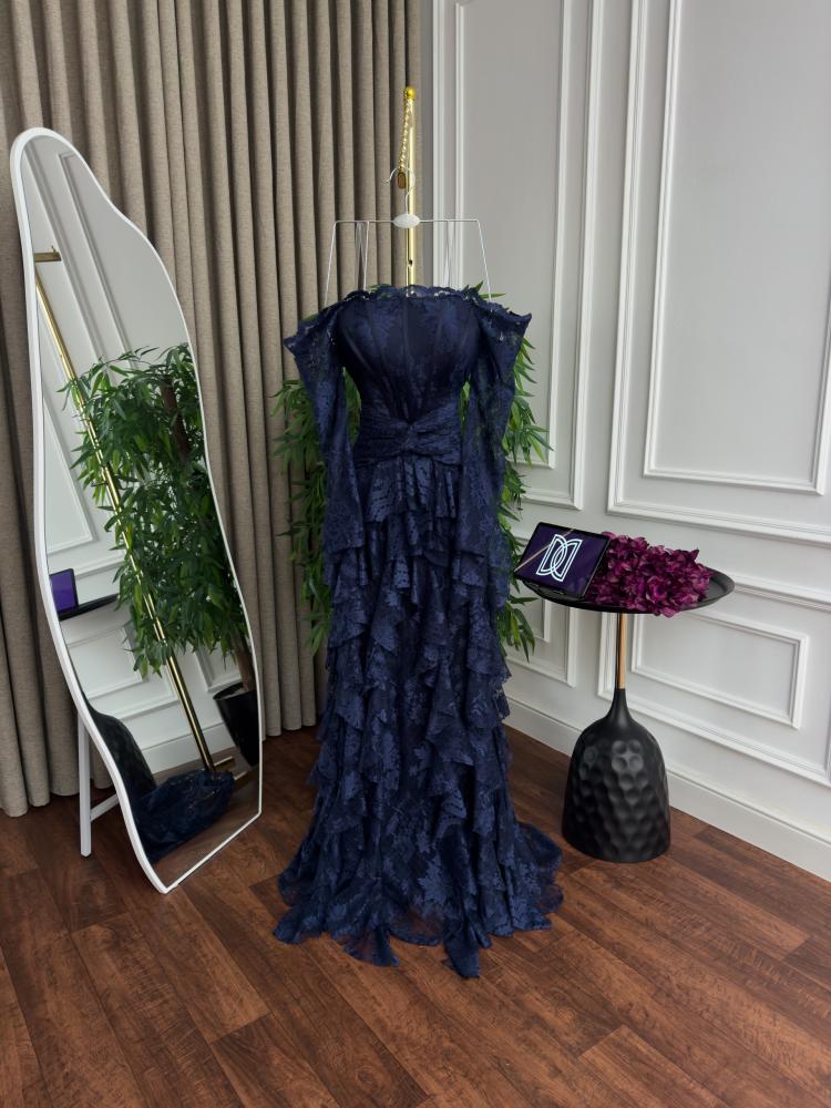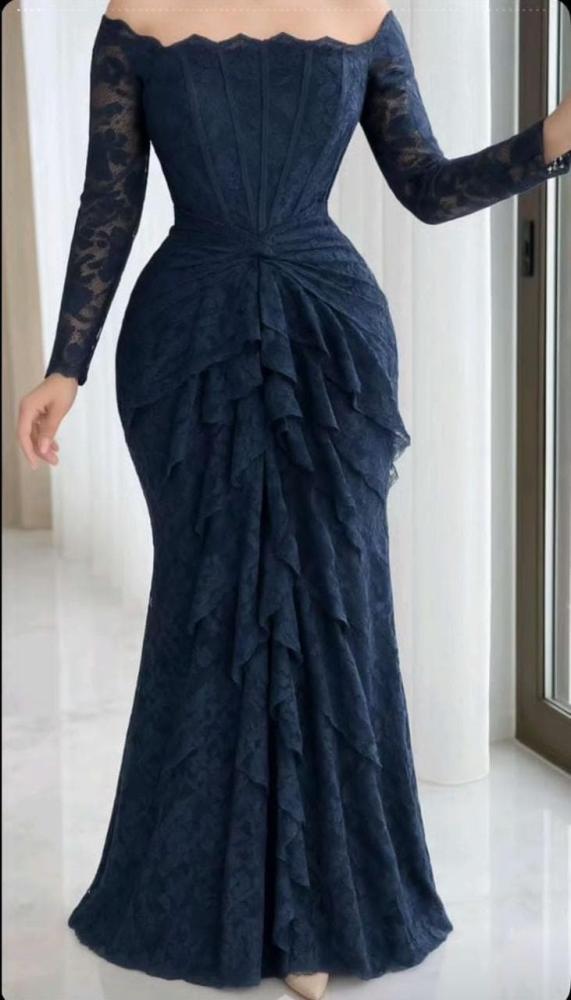 فستان سهرة أنيق باللون الكحلي الداكن، يتميز بتصميم يجمع بين الأناقة والجاذبية.