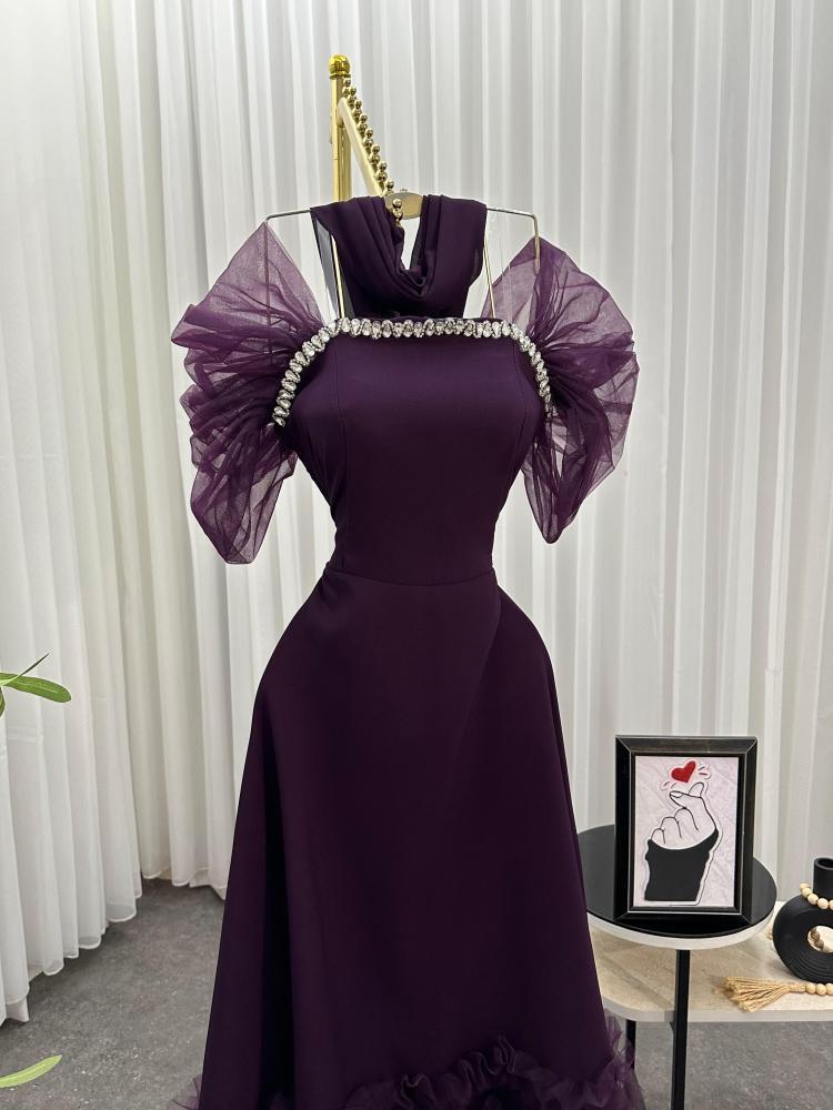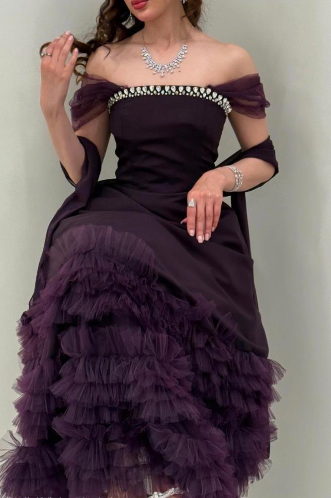 يتميز الفستان بتصميمه الساحر الذي يجمع بين الأناقة والفخامة. الجزء العلوي من الفستان ضيق وبدون حمالات، ومزين بتطريز لامع يضفي عليه لمسة من البريق. أما الجزء السفلي، فيتكون من تنورة واسعة متعددة الطبقات من الكشكشة المنفوشة، مما يمنحه مظهراً درامياً وجذاباً. هذا التصميم يجعله مثالياً للمناسبات المسائية والحفلات التي تتطلب إطلالة فريدة ومميزة.